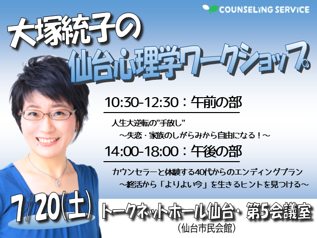 7/20(土)に大塚統子カウンセラーが仙台で開催する心理学ワークショップに
